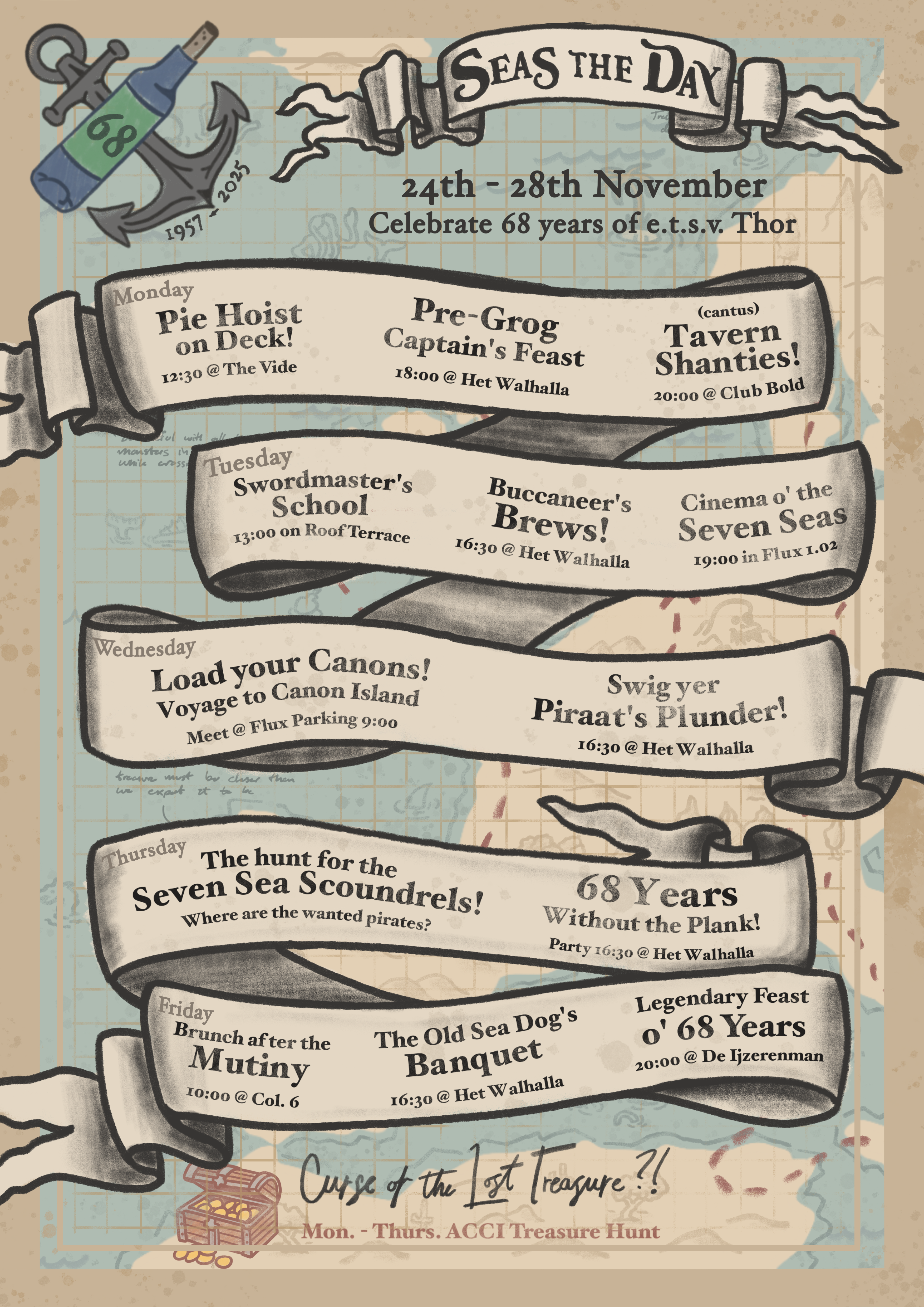 The Old Sea Dog's Banquet" (The Oude Bokken Borrel): Former Board members of Thor and invited to reunite in Het Walhalla and celebrate the 68th Dies with the new Board! Hoist yer mugs, meet yer old captains of Thor, and trade in yer grog fer a sip o’ the finest Bokma!